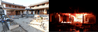图14 云南丽江传统民居全尺寸火灾动力学以及防火措施验证实验(图片来源:火灾科学国家重点实验室)
