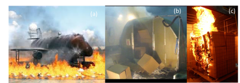 图15 飞机火灾模型实验:(a)全尺寸飞机火灾与灭火测试系统;(b)飞机货舱火灾模拟实验;(c)模拟飞机货舱高空低压环境下纸箱火灾(图片来源:清华大学公共安全研究中心)
