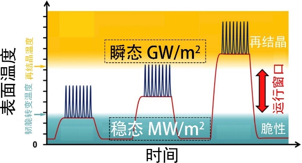 显然,热核聚变装置第一壁材料面对的工作环境十分极端,包括严重的溅射侵蚀、中子辐照以及高热流作用。在图5中,我们以DEMO为例,示出第一壁在稳态工况下直面的热环境数据:0.3-2MW/m2的长时热流,同时叠加高达GW/m2量级的瞬态热流。这里热流单位MW/m2和GW/m2分别表示每平方米兆瓦和吉瓦,它们和“瓦(W)”的关系是:1MW=106W,1GW=109W。因此,如何防住如此高的热流是建设核聚变装置的一个关键难题。