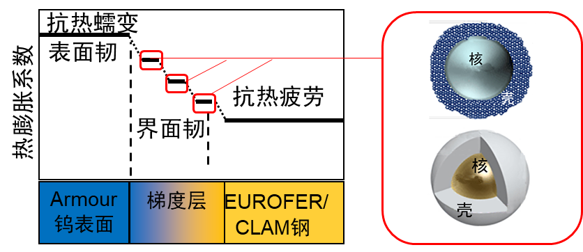 近年来,中国科学院力学研究所的表面与界面改性创新团队与德国卡尔斯鲁厄理工学院(KIT)材料力学与仿生研究团队联合,开展表面与辐照环境的耦合作用、表面层与结构界面协同以及表面层的界内行为等研究。在热核聚变第一壁结构优化这个重大问题上,国际上不少研究团队做了很多年的工作,大部分团队在做新材料的选择和优化,而我们则瞄准了更前沿关键的问题:长时、可产氚的功能结构研究。当然,我们的研究工作并不是一帆风顺的,一开始考虑第一壁厚度对供氚速率(TBR)的影响,第一壁始终无法克服长时工况下的疲劳-蠕变损伤。这里涉及“疲劳”“蠕变”等力学概念,它们都是材料在长时工况下发生损伤的诱因。所谓“疲劳”是是指材料在循环的交变应力作用下产生裂纹、发生破坏的现象。而“蠕变”则是材料在保持应力不变的条件下变形随作用时间延长而增加的现象。当材料长时间处于加热当中时,蠕变会更加剧烈,这便是“热蠕变”。当蠕变发展到较大程度时,就可能影响材料和部件发挥功能作用。“热疲劳”是指由于环境温度梯度循环变化而产生的疲劳破坏现象。显然,第一壁结构应当能够抗热蠕变、抗热疲劳的。后来理论研究表明可以设计成毫米级厚度后,我们发展了基于RCC-MR蠕变-疲劳线性损伤累积的表面力学损伤机理模型,并提出了融合功能梯度材料通用机制和独特核壳机制的韧化方法,为第一壁构筑方法研究提供了一条新的思路。图6示出了能够抗高热流的核壳设计理念,功能结构基元由钨核和 EUROFER/CLAM钢壳组成,通过调节核壳的厚度比,实现细观尺度上的梯度(钨逐层减少,钢逐层增加)。这样可以增加结构的韧性,这里的“韧性”是指材料阻止裂纹扩展的能力。我们设计的梯度韧化结构为实现第一壁 “既防又放”的目标奠定了科学基础。