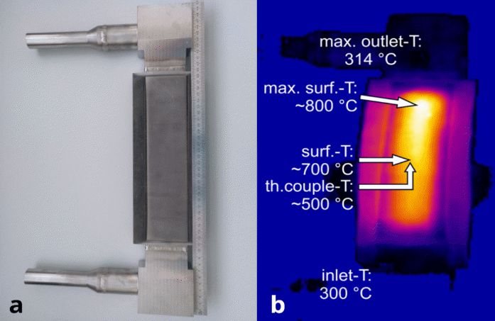 随后,团队在KIT的氦冷回路HELOKA大科学装置上完成ITER-TBM高韧模块的强氦冷试验,其中热流密度0.9MW/m2,循环1000周次,加热和冷却时间分别为180s和150s,相比于ITER第一阶段(2035年前)的热流密度0.5MW/m2提高了80%。图8示出了带氦气冷却的高韧模块及其在氦冷回路中表面施加0.9 MW/m2热流时的测温结果。