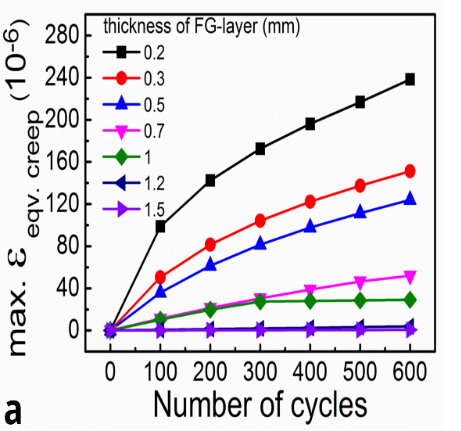 我们研究团队所发展的第一壁构筑方法是基于RCC-MR蠕变-疲劳线性损伤累积模型(作为科普文章,对此力学模型的细节不加说明,有兴趣读者可参阅文献[1])。关于第一壁Armour钨/EUROFER低活化钢的功能梯度涂层,我们对典型热流工况进行了有限元模拟。在研究中,首先分析了梯度层内最大非弹性应变,并根据非弹性应变分别计算疲劳损伤及蠕变损伤,并通过改变梯度层层数、梯度成分分布和各层厚度等特性参数,将最大非弹性应变调节至梯度层内。关于核壳微结构构造,我们研究团队模拟了核壳和非核壳两种结构形式,结果表明核壳微结构能获得大厚度低应力及高结构稳定性,模拟结果与实验结果均表明了可以将微应变离散在核内。图7分别示出了有限元模拟方法计算随使用次数增加不同梯度层的最大蠕变应变、热喷涂制备的钨/EUROFER钢功能梯度涂层以及核壳微结构的应变计算与EBSD实验结果。