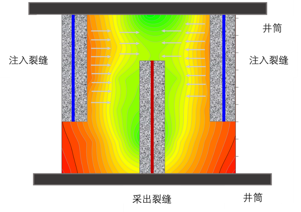 在这个高压大尺度物理模拟实验系统中,我们研究团队研究了不同注采间距、注采裂缝长度对水平井情况中线注线采注水开发过程的影响作用。我们的研究发现:致密油藏水平井采用异井线注线采时,在相同的注入压力梯度0.11兆帕/米情况下,50厘米×50米×3厘米模型I和50厘米×40厘米×3厘米模型II的水驱油效率不同,这里的“水驱油”是指注入水驱出原油的采油方式。实验结果表明:模型II的驱油效率较高,为32.91%。模型II的注采间距为18厘米,相比而言,模型I的间距是23厘米。图5是物理模拟试验中驱油水的流动示意图,其中示出两条注入裂缝和单条采出裂缝,而上下两块平板代表水平井的筒壁。线注线采水驱油过程中,注入水首先沿着注入裂缝向采出裂缝方向对称均匀地压力传导,实现均匀地注水推进。这时,模型中注入裂缝两端处相对于采出裂缝不同纵向位置处的压力呈“V”字型,且关于采出裂缝对称分布。在水平井异井线注线采注水中,不同裂缝长度驱油效率是不同的,试验中分别采用了注采裂缝长度为36厘米,41厘米和46厘米的不同模型。结果表明:注采裂缝越长,驱油效率越高。此外,我们的实验还揭示,致密油藏体积压裂水平井线注线采开发过程中,油水呈现区别于径向流的线性流动。在所谓的“径向流”中,流体在平面上从四周向中心井点汇集或从中心井点向四周发散;而在所谓的“线性流”中,流体做渗流流动时全部流线为互相平行的直线;在实际生产井的井底附近,基本上都是径向流动方式。由于渗流距离小于常规井网注采井排距,使得渗流阻力(多孔介质对渗流的阻力)大幅度降低,从而有效增大了水驱油波及范围,相比于衰竭式开发驱油效率至少提高8个百分点。