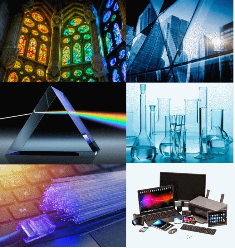 图2 玻璃的多重应用:建筑、光学、器皿、通讯、电子(图片来源:网络)