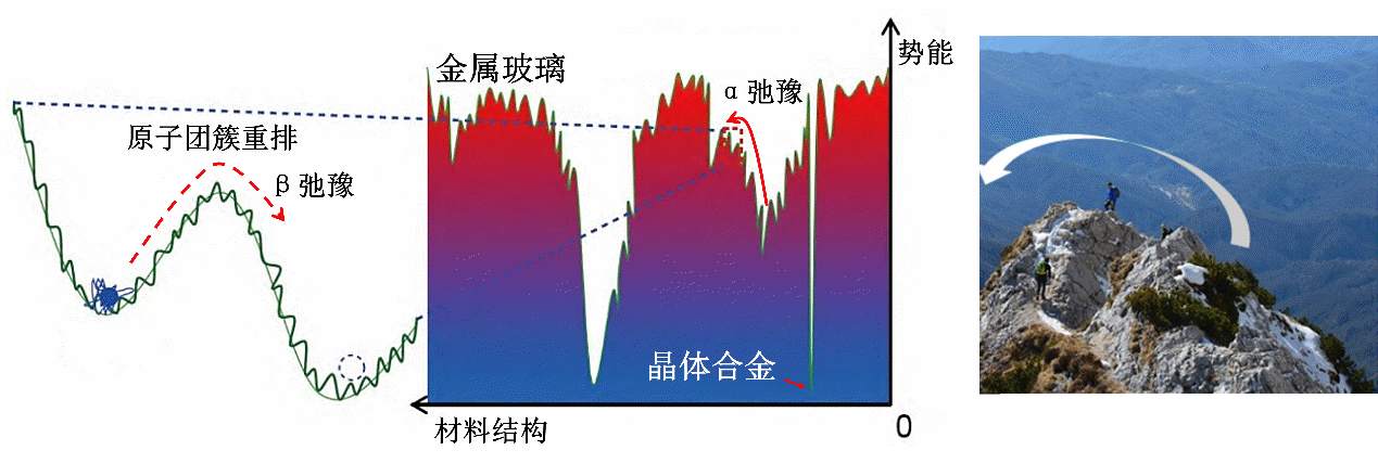 玻璃是一种非晶态固体材料,其主要特征是原子排列的无序性,或者说,原子排列没有周期性(参见图3左)。这种无序性是玻璃定义的重要标志,而不是人们通常认为的透明性或其他特征。在玻璃大家族中,一颗新星近年来备受瞩目,那便是金属玻璃。它以独特的结构和优异的性能跻身凝聚态物理与材料科学的研究前沿。传统玻璃是由氧化物和硅酸盐等无机非金属物质构成的。而金属材料则倾向于形成原子排列有序的晶体结构(参见图3右)。一般而言,要使金属材料形成原子无序排列的玻璃态结构相当困难,必须通过合适的成分设计,再加上快速冷却的方法,才有可能制备成功。因此,金属玻璃兼具传统氧化物玻璃和金属材料的双重优点。金属玻璃的无序结构使其处于热力学上的亚稳态,图4给出稳态和亚稳态的示意:图中横坐标表示原子排列不同的材料结构,而纵坐标则表示相应材料结构的势能,即能量状态。我们将物质的能量状态比作山峦不同位置的高低,原子排列有序的晶体合金就位于稳定的山底,而原子排列无序的金属玻璃则位于不稳定的半山腰。当外界温度或载荷施加于金属玻璃时,其内部原子就如同登山者一样,通过攀爬、翻越能量势垒从一个势能盆地到达另外一个势能盆地,这一过程被称为“弛豫(relaxation)”。β弛豫指的是翻越小能量势垒的过程,而当一连串的β弛豫发生并相互关联到达临界状态时,便形成了α弛豫。在势能形貌上,α弛豫表现为翻越巨大的能量势垒的过程。由于处于亚稳态,金属玻璃会随时间自发地发生弛豫,从高能态向低能态转变,这一过程被称为“老化”。相反地,通过输入外部能量,使金属玻璃从低能态转变成高能态的过程则被称为“年轻化”。一般而言,年轻化程度越高,金属玻璃的塑性变形能力也越好。因此,弛豫现象与金属玻璃的原子重排、老化、年轻化以及力学性能等密切相关。金属玻璃的弛豫行为是凝聚态物理领域最为深奥和充满挑战的课题之一。
