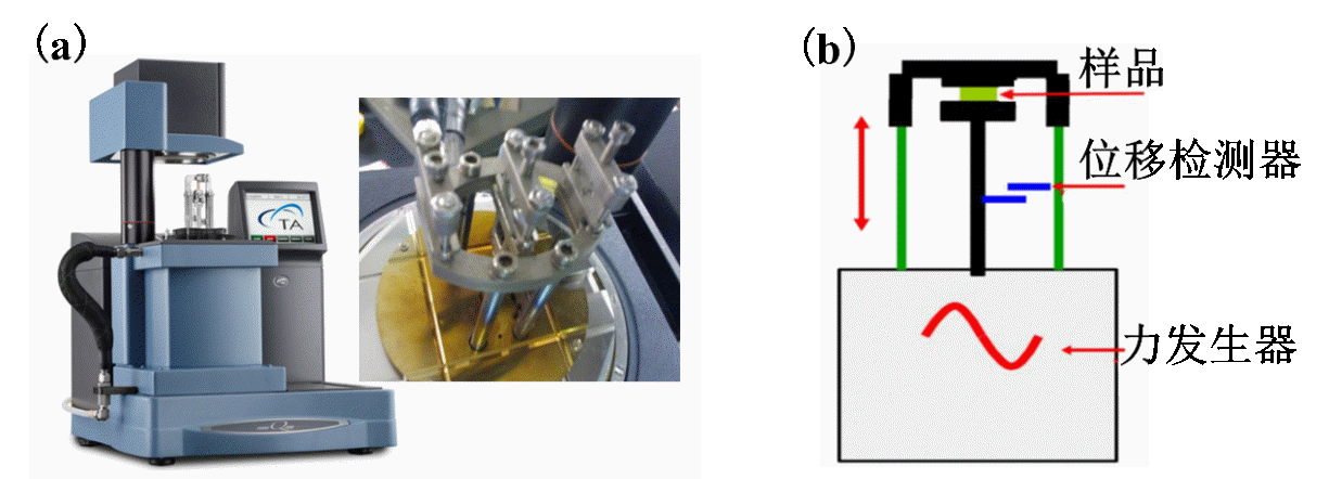 图5(a)测量金属玻璃弛豫谱的DMA-Q800设备;(b)DMA实验加载
