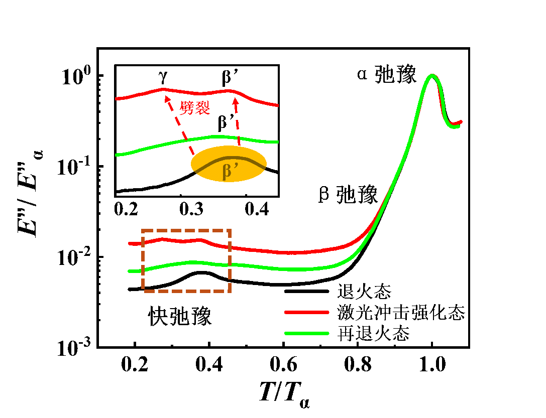 图8 退火态、激光冲击强化态、以及再退火态金属玻璃的约化动力学弛豫谱。实线框插图为虚线框区域的放大图(图片来源:文献[5])