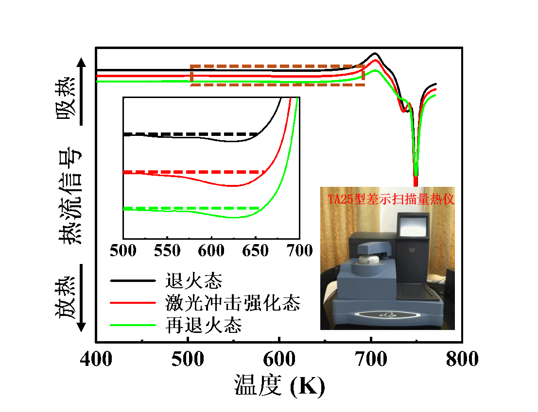 图9 退火态、激光冲击强化态、以及再退火态金属玻璃的量热曲线。实线框插图为量热曲线放热区域的放大图(图片来源:文献[5])