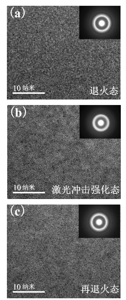 图10 金属玻璃的HRTEM图像:(a)退火态;(b)激光冲击强化态;(c)再退火态。插图为相应的选区电子衍射环(图片来源:文献[5])