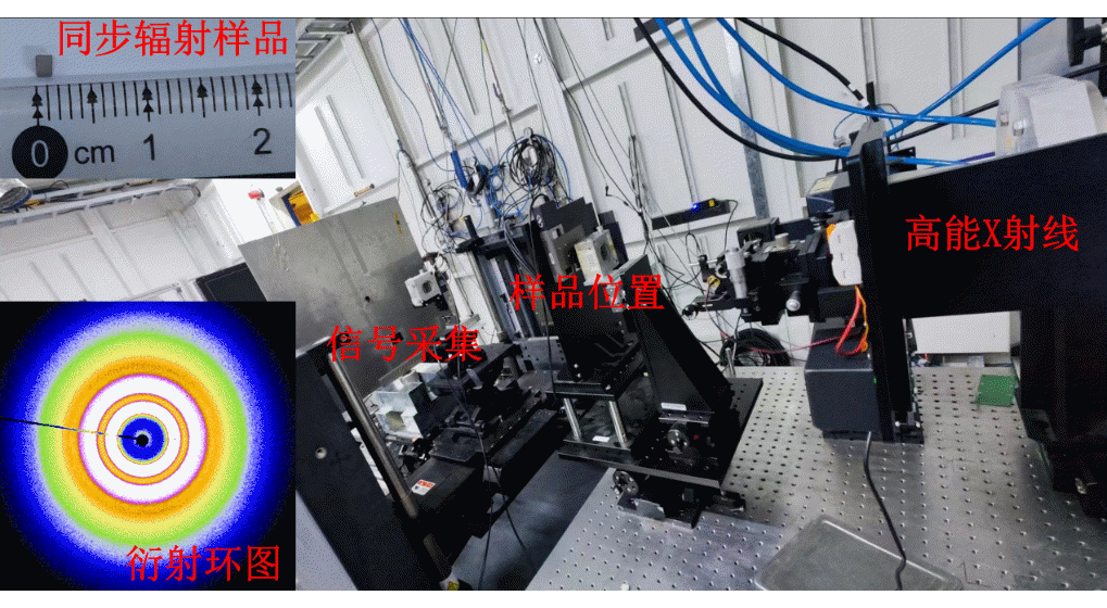 图11 北京同步辐射3W1实验站高能X射线衍射实验装置图,样品图以及衍射环图(图片来源:作者自制)