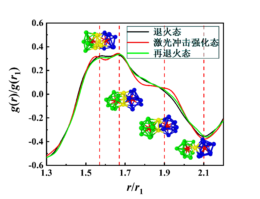图13 退火态、激光冲击强化态、以及再退火态金属玻璃的约化RDF第二峰(图片来源:文献[5])