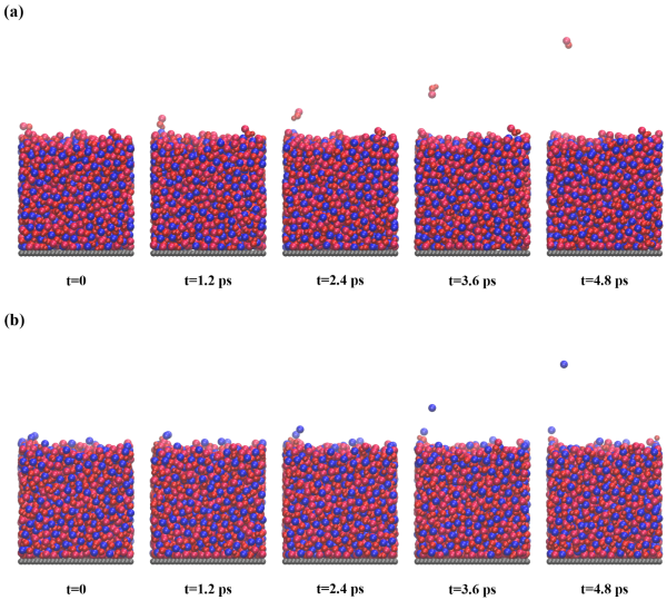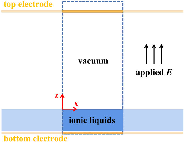 基于这种情况,中国科学院力学研究所微纳米流体力学团队利用分子模拟,探讨了离子液体-真空界面电场诱导离子喷射现象。这里提到的“分子模拟”是指利用理论方法与计算技术,模拟分子结构与微观行为并进而仿真分子体系的各种物理、化学性质的方法。分子模拟的主要方法有两种:分子蒙特卡洛法和分子动力学法,我们采用的是后者。分子动力学方法是基于牛顿力学原理来模拟原子或分子的物理状态和运动轨迹的方法。具体而言,它通过对相互作用粒子的牛顿运动方程进行数值解析来确定体系内粒子的轨迹,而粒子间的作用力和势能则采用粒子间力场来确定。这项工作为选择合适的离子喷射分子模拟策略提供了指导,并为后续研究更复杂的电喷射现象奠定了基础。在图3中,我们给出了不同时刻t下两种离子的喷射情况,其中时间的单位是皮秒(ps)。这里,1皮秒=10-12秒。图4则示出我们进行离子液体-真空界面电场诱导离子喷射模拟系统的示意图,其中离子液体(ionic liquids)位于底部电极(bottom electrode)上方,离子液体的上方则是真空(vacuum),外加电场(applied E)指向顶部电极(top electrode)。图4中虚线框给出分子模拟系统的边界。
