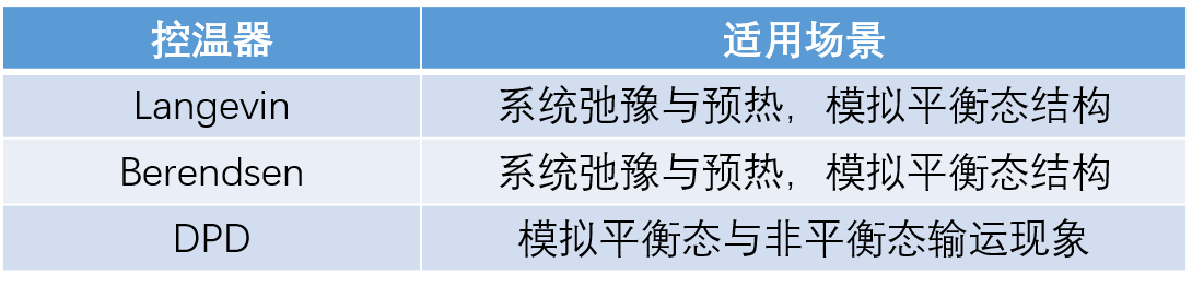 图5 分子动力学模拟中不同控温器及其适用场景(图片来源:作者自制)