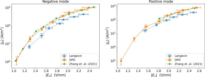 图6 电流密度随液面电场的变化:阴离子发射模式(左);阳离子发射模式(右)。蓝色、橙色和绿色分别代表Langevin、DPD和Berendsen控温器作用下的结果(图片来源:参考文献[2])