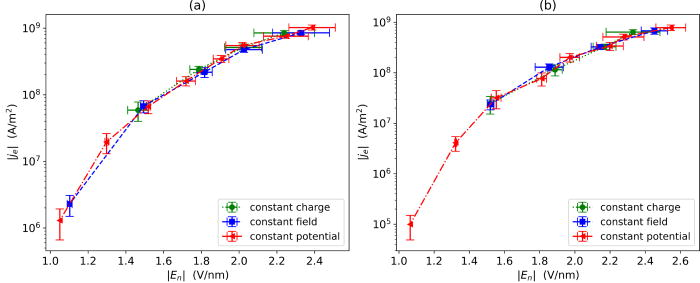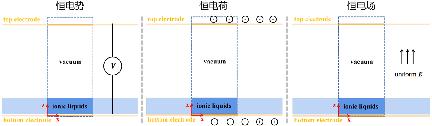 进一步,研究团队又探讨了恒电势(constant potential)、恒电荷(constant charge)与恒电场(constant field)三种施加液面电场的方法对电流密度的影响。图7是施加在液面上电场的示意图,图8则给出电流密度随液面电场的变化曲线。从图8示出的模拟结果,可以发现采用这三种方法所得到的电流密度-液面电场曲线基本一致。在以往的离子喷射分子模拟中,研究者多使用恒电势方法,而且目前国际上只有少数特定的分子模拟软件可实现恒电势模拟。但是,我们实现了三种施加液面电场方法的模拟。相比而言,恒电荷与恒电场方法在常用的开源分子模拟软件中可以直接使用。研究表明,对于平行电极-平面液膜系统(参见图4),恒电荷/恒电场方法能够较好地模拟离子喷射现象。