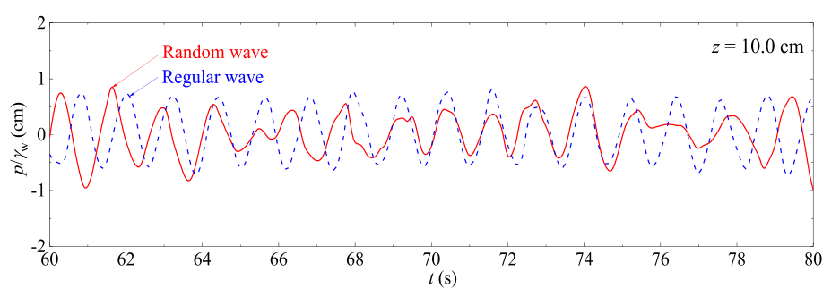 波浪的类型不同,所诱导的海床内部超静孔压也有所差异。迄今,关于海床孔压响应的研究主要限于规则波情况;然而,如前所述,实际波浪运动具有显著的随机性。因此,如何科学描述随机波诱导的海床孔压响应是当前海洋土力学研究的难点问题。针对这个问题,中国科学院力学研究所流固耦合系统力学重点实验室(LMFS)的流固土耦合力学研究团队开展了大型流固土耦合波流水槽(参见图4)模型试验及理论研究。我们在水槽试验中制备细砂海床,采用孔隙水压力传感器测量海床不同深度处的超静孔压响应。图5给出了时域范围内规则波(Regular wave)和随机波(Random wave)作用下海床特定深度z=10厘米处的超静孔压时程曲线,其中蓝色虚线对应规则波,红色实线对应随机波,纵轴p/γw是以水柱高度(单位为厘米)表示的孔隙水压值。由图5可见,规则波诱导的超静孔压呈现出规则的正弦式波形,并且孔压脉动周期与规则波浪周期保持一致。然而,在随机波浪作用下,海床孔压响应则具有明显的不规则性。