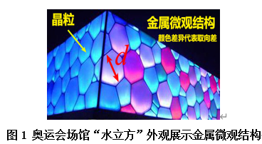 材料是一个既古老又充满活力的研究领域,从石器时代开始,人类文明的进步就离不开新材料的发明和应用。从铁器时代至今,人们对金属材料的制备和加工技术不断创新和提高,发现了“百炼成钢”的奥妙所在。金属材料由于拥有良好的加工成型能力一直被广泛的应用在生产生活中的各个角落。将金属材料中晶粒尺寸减小至纳米尺寸制备纳米晶晶体材料,可以显著提高材料的强度和硬度。这里的“晶粒”是指晶体在高温凝固过程中形成的取向(位向)不同的单元。如果把"水立方"看作是一块金属,那外壁面上每一个“水泡”结构就可以算作一个晶粒,而其中所示出的“d”就是晶粒尺度(参见图1)。而材料的“强度”是指材料在抵抗破坏时单位面积上所能承担的最大载荷,它表征材料抵抗破坏的能力;一般而言,人们希望材料有高的强度,这样就不容易被损坏。那么“硬度”呢?它是材料抵抗更硬物体压入其表面的能力,也可以说是抵抗局部变形,特别是塑性变形、压痕或划痕的能力。材料的强度和硬度是其在应用过程中最关键的两个性能指标。