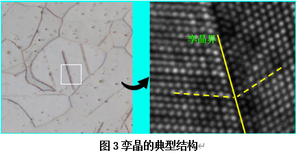 为了解决金属材料中强度与塑性之间的制约关系,学者们通过大量的实验探索提出了“异构”金属的概念。因为材料的微观结构决定其宏观力学性能,所以就设计出在微观尺度上具有不同性能单元的金属材料。图2给出了一些典型的异构形式,如梯度结构(晶粒尺寸呈梯度分布变化)、双峰结构(由两级尺寸的晶粒构成)、层片结构(大小晶粒逐层相间排列)、双相结构(软-硬相晶粒相间排列),纳米孪晶结构(晶粒的内部引入高密度孪晶界)以及多层板结构(不同性能的材料之间通过化学键结合形成,层厚在百微米以内)。这里提到的孪晶(参见图3)是指晶粒内部的两个区域呈镜面对称分布。这个对称面称为孪晶界,它可以和位错发生交互作用,从而影响材料的性能。
