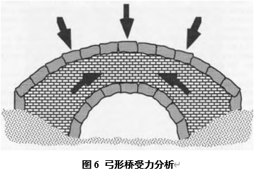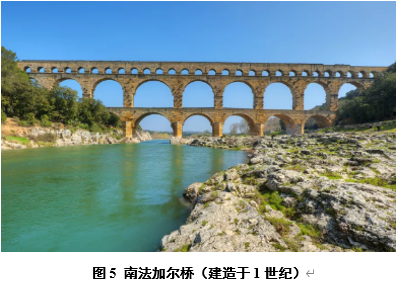 桥梁是人类社会交通的必需,由于人类早期建筑材料的匮乏,不管是中国的赵州桥还是法国的加尔桥,早期只能采用脆性的砖石结构。著名的南法加尔桥(参见图5)建于公元1世纪。它不仅仅是座桥,也是罗马时代精巧的供水系统,全部就地取材,采用当地的一种典型脆性材料石灰岩建筑而成,一直使用至今。现代的结构工程师对这类拱桥做了相应的力学分析(参见图6),表明它们采用了合理的结构设计,使得桥梁在使用过程中不受拉力。
