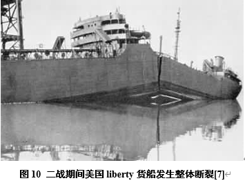 工业革命以后,人类生产钢铁的能力大幅提升,与砂土类材料相比,钢铁材料能够承受拉伸载荷,人们终于突破了材料对结构的限制。不过人们逐渐发现,在远低于设计载荷下,钢结构建筑会突然发生断裂事故。例如1969年,美国俄亥俄河上的一座大桥突然断裂,造成严重的伤亡后果,当时载荷仅为设计载荷的40%。在第二次世界大战及其以后,大量高强度和超高强度材料在工程(特别是宇航和军事工业)中广泛采用,用这些材料制成的工程结构元件,人们曾根据传统的强度理论作过安全性的计算和校核,但却发生了许多严重断裂事故。二次世界大战期间,美国建造的2000多艘Liberty货船,发生了1000起以上的断裂事故,其中有200艘因为断裂导致沉没或者彻底破坏。图10为一艘Liberty货船的断裂事故图。1950年,美国北极星导弹固体燃料发动机壳体在试验时发生爆炸,其破坏是由于壳体中存在0.1~1mm裂纹源引起的。1975年,美国一架DC-10大型客机在芝加哥奥黑尔国际机场起飞后不久坠毁。据分析,事故是由于飞机发动机螺钉疲劳断裂引起的。