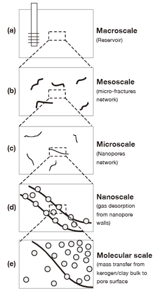 在地学中,一般将通过对实际岩心进行CT扫描或者基于断面二维图像并采用数学算法重构得到的与实际岩石具有对应关系的三维数据体称为“数字岩心”,基于数字岩心可开展流动模拟、弹性、声学和电学参数的模拟计算等。由于页岩具有从纳米到百微米级别的孔隙、裂缝结构。从图3的图示中可以得知,它的流动通道从分子尺度(Molecular scale)到纳米尺度(Nanoscale),再到微观尺度(Microscale),再到介观尺度(Mesoscale),直到宏观尺度(Macroscale)。对于这样复杂的体系,想通过直接成像来得到既能分辨孔隙又具有代表性(达到该尺度后相关属性稳定)的三维数据体,是不现实的。因此,人们只好借助数学上的三维重构算法来建立,但这样得到的仅仅是具有一定几何相关性的结果。我们提出了基于实测孔隙度、渗透率约束并结合可实现非均质重构的算法,所得的“数字-实验岩心”不仅几何上与岩石具有相关性,而且相关参数与实测结果一致。这种更为接近真实页岩的特点是建立在本平台所提供的测试数据基础上的。基于“数字-实验岩心”,我们可以获得不同类型孔隙内的含气性、流动及不同温压条件下的特征,从而为分析页岩气微观赋存与流动提供了更有效的方法和模型。