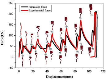 研究团队同时开展了试验验证工作,并获得了与计算结果相符的结果。图4所示的压溃力-位移曲线,其中红色曲线为实验结果,黑色曲线为模拟计算结果。实验是在落锤装置中进行的。在落锤碰撞实验中,落锤从3.7米高处自由下落,由于重力作用,在碰撞薄壁圆筒试件前速度约为8.5米/秒。圆筒试件的屈曲过程由高速相机记录。试件底部装有压力传感器以测量瞬时压溃力,传感器的电压信号则输入到一个高速数据采集系统中。图5为落锤碰撞的实验装置示意图,其中锤头6的质量为200kg,梯度缺陷筒5安置在底座1上,底座安装有冲击力传感器3(量程300kN,频响20kHz),用高速摄影相机9进行梯度缺陷筒冲击变形过程的采集。