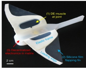 随着科学家对鱼类游动方式、推进机理的认识加深、驱动技术的革新、材料制备、智能规划与决策等技术手段的快速发展,智能机器鱼从实验室环境一步步走向实际的湖泊、展览馆,游向海洋,迈向更有意义的应用层面。特别是,随着材料和工艺的发展,更接近真鱼的软体机器鱼越来越多呈现在大众面前。这种柔软的机器鱼是环境友好的,不会吓倒真正的鱼。麻省理工学院研究人员利用一种名为SoFi的软体机器鱼(Soft Robotic Fish)去监视生活在斐济珊瑚礁里的鱼,实现了人类行为对环境干扰的最小化。浙江大学等单位研制的仿蝠鲼和狮子鱼的机器鱼采用介电弹性材料智能驱动,实现了万米马里亚纳海沟的驱动实验。佛罗里达大学研究人员在仿生金枪鱼身上安装了人工肌腱,并且让它根据速度调节鱼尾的刚度,使得能耗平均下降了一半。这些机器鱼在图3中展示。