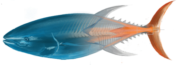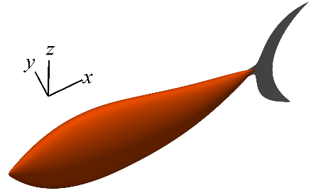 中国科学院力学研究所银波研究团队针对智能机器鱼的研发开展了大量工作。为了研制出在水中能够游得快、消耗能量少的智能机器鱼,首先必须掌握鱼类在水中的游动机理,其中会基于对金枪鱼游动的观察,我们了解到鱼类在特征性的波动游泳运动中,肌肉沿着身体从鱼头向鱼尾顺序收缩,产生身体弯曲的后向运动波,从而扰动了周围的水体。这里定义尾鳍从左向右的摆向(Left-to-Right Stroke)和右向左的摆向(Right-to-Left Stroke)合为一个完整周期,鱼类不断重复这个侧向摆动过程实现向前高效游动。然后,应用相关的流体力学知识,建立如图4所示的金枪鱼的三维自主游动模型。