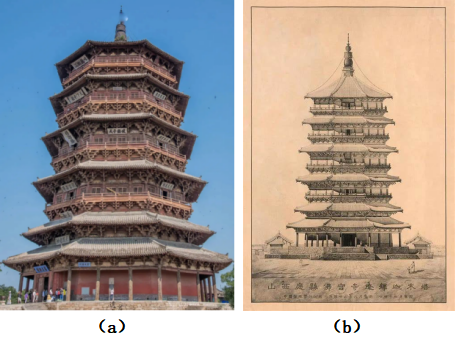 图1 山西应县木塔:(a)实景照片;(b)梁思成林徽因手绘图(图片来源:网络)