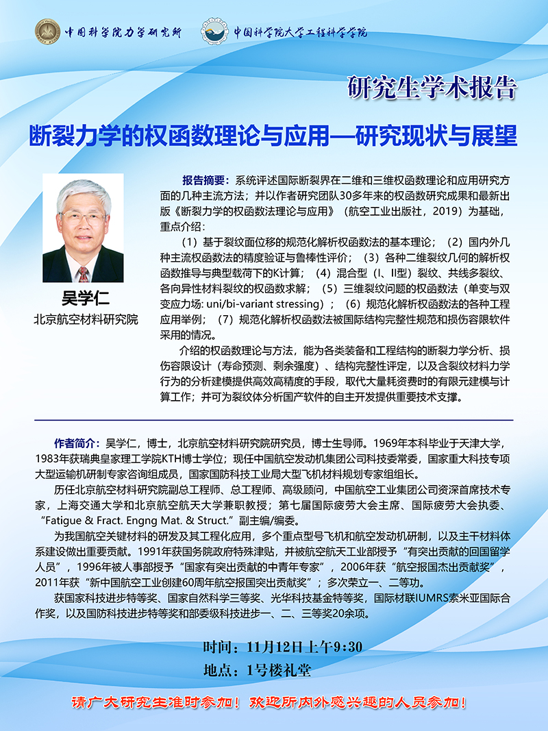 (11月12日上午9:30,力学所礼堂,吴学仁 研究员)断裂力学的权函数理论与应用——研究现状与展望