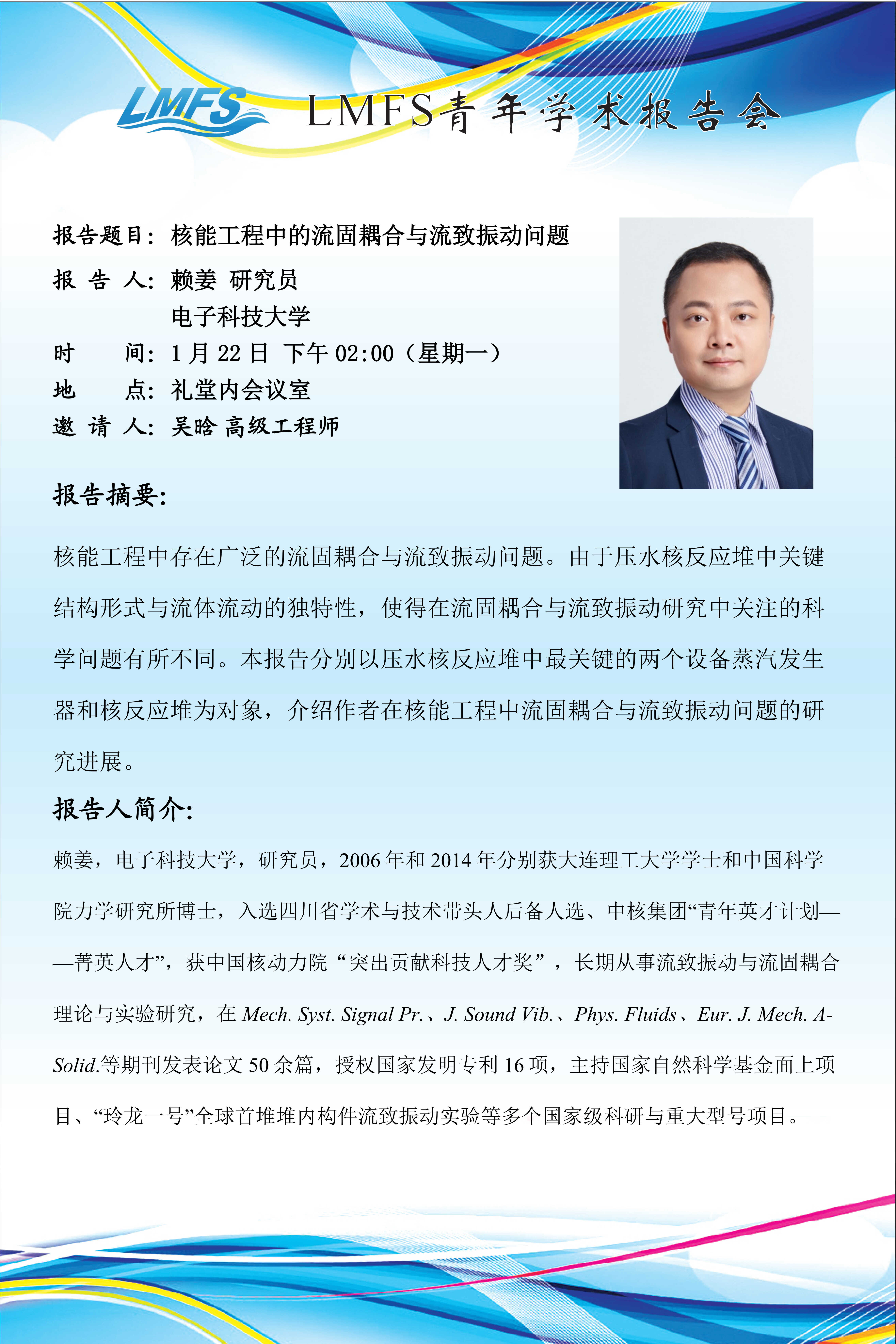 (LMFS青年学术报告1月22日15:30,1号楼礼堂内会议室)核电站管道震动问题及应对策略