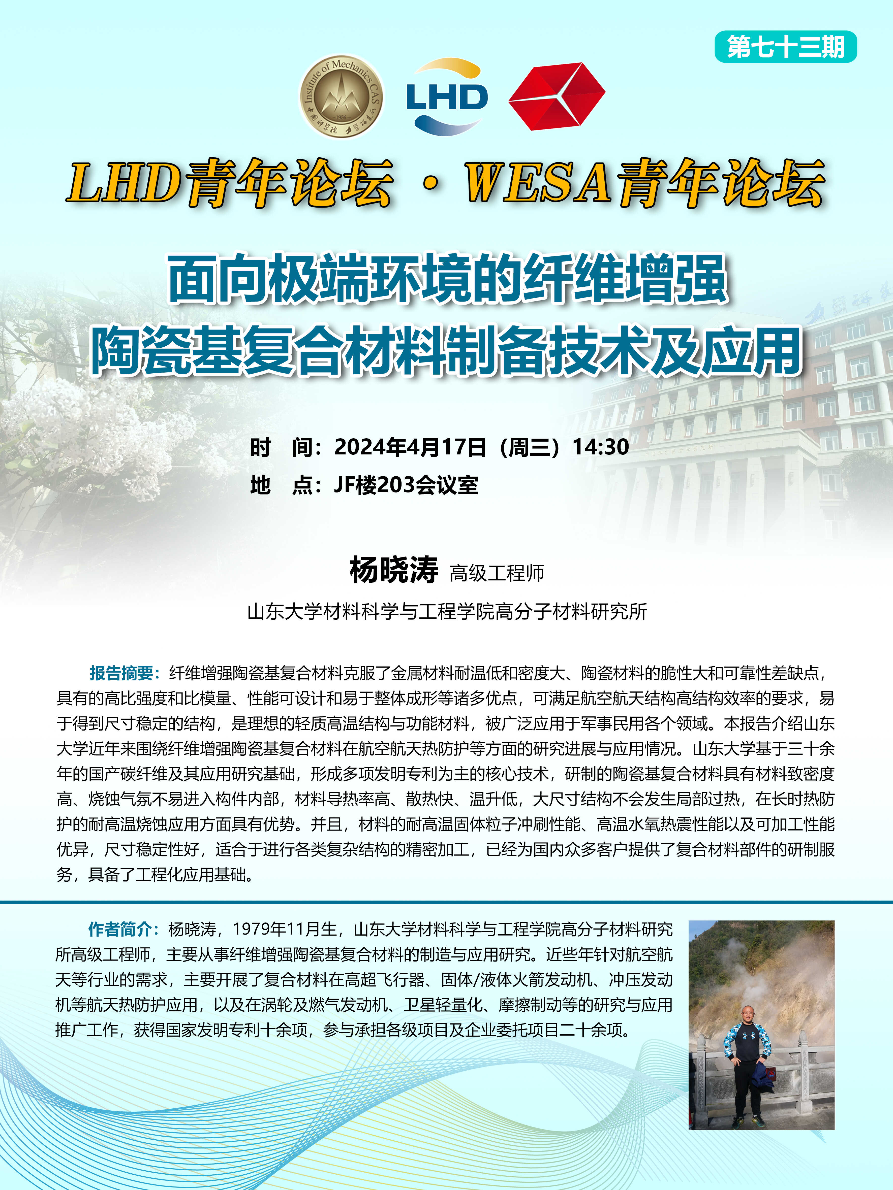 (LHD青年论坛&WESA青年论坛 4月17日 14:30 JF楼203会议室)面向极端环境的纤维增强陶瓷基复合材料制备技术及应用