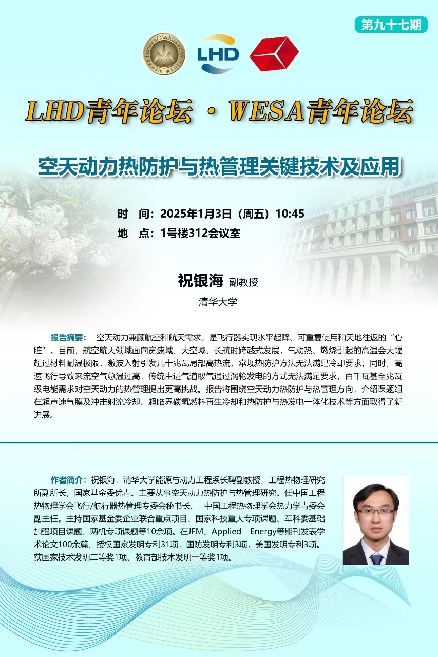 (LHD青年论坛&WESA青年论坛 1月3日10:45 一号楼312会议室)空天动力热防护与热管理关键技术及应用