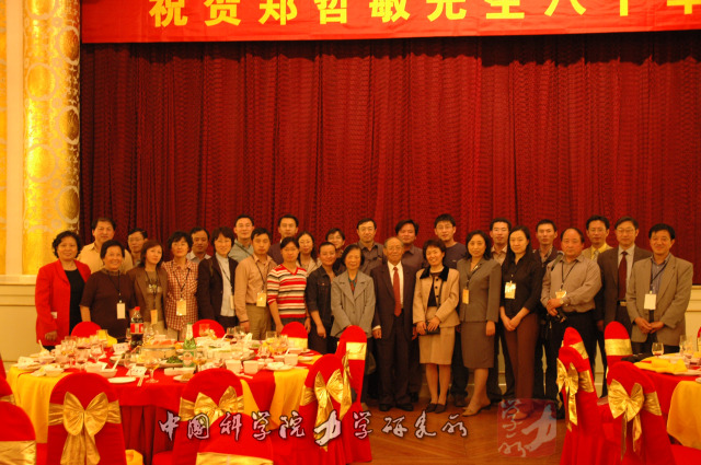 2004年力学所举行祝贺郑哲敏八十华诞大会,左一李和娣,左七孟庆国,左九杨亚政,左十一何林,右二洪友士,右三樊菁,右十一黄晨光,右十二郑哲敏,右十四卢凤才
