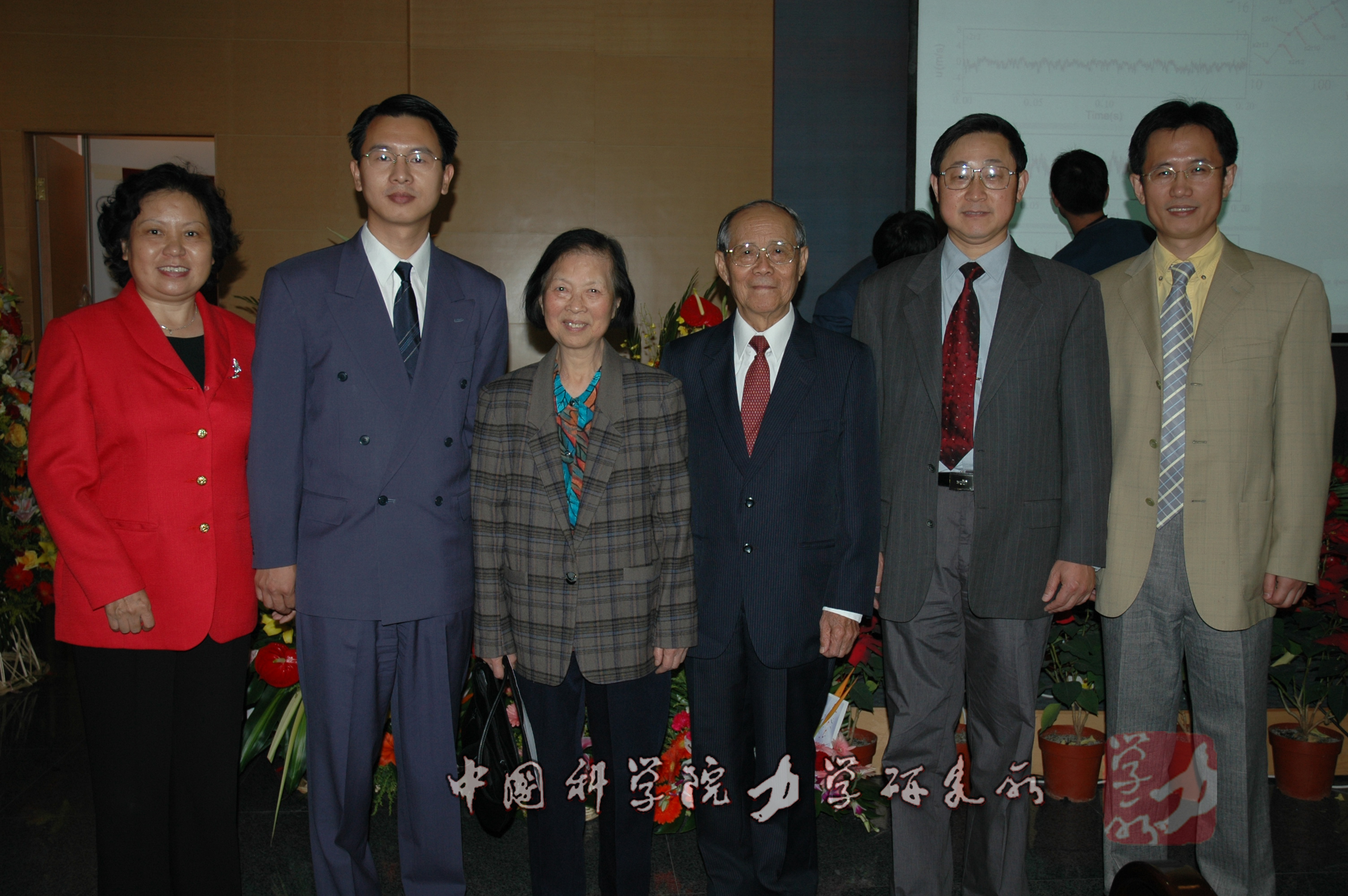 2004年力学所领导举行祝贺郑哲敏院士八十华诞应用力学报告会,右起樊菁,洪友士,郑哲敏,卢凤才,何林,李和娣