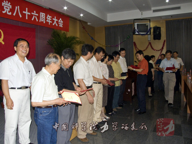 2007年郑哲敏获力学所优秀共产党员合影,左起周德进,郑哲敏,陈光南,张新宇,龙勉,汪清,武景春,武晓雷,杨亚政等