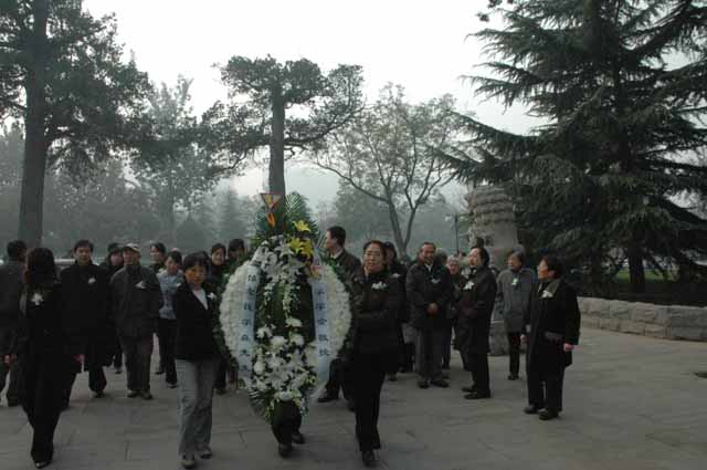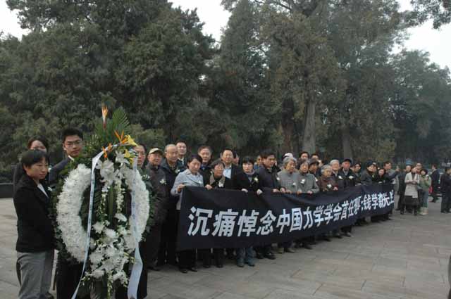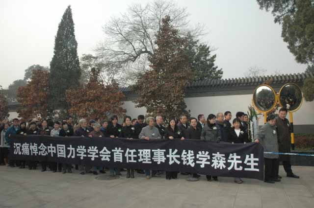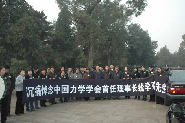 中国力学学会第一任理事长钱学森先生的遗体告别仪式,11月6日上午在北京八宝山殡仪馆举行,中国力学学会理事长李家春院士偕同白以龙院士、崔尔杰院士、伍小平院士、朱位秋院士,中国力学学会副理事长樊菁、方岱宁、佘振苏,秘书长王建祥、杨亚政、刘青泉,以及学会办公室部分老同志和全体工作人员一行三十余人前往送别。 上午九时左右,前来参加送别仪式的中国力学学会全体人员即来到八宝山革命公墓,沿着吊唁路线顺序前往礼堂。路上,学会工作人员在队伍前方高举着花圈,挽联上写着“沉痛悼念钱学森先生”;在队伍一侧举着9米长的横幅,上面写着“沉痛悼念中国力学学会首任理事长钱学森先生”。 十时左右,中国力学学会全体送行人员来到八宝山革命公墓礼堂,在哀乐声中缓步进入,送别学会第一任理事长钱学森先生。 八宝山革命公墓礼堂庄严肃穆、哀乐低回,礼堂上方悬挂的黑色白底的横幅,上面写着“沉痛悼念钱学森同志”横幅下面是钱老的遗像,遗像的正下方摆着两个花圈,一个是儿女敬献的花圈,挽联上写着“爸爸,您永远活在我们心中”,另一个花圈是钱老的孙辈们敬献的,上面写着“爷爷我们永远想念您”。钱老遗体前方摆放的是妻子蒋英敬献的花圈,挽联上写着“学森安心走好”。钱老的遗体安卧在鲜花翠柏丛中,身上覆盖着鲜红的中国共产党党旗。 据了解,清晨六七点钟,就有很多民众自发赶到八宝山革命公墓等待参加钱老的遗体告别仪式。追悼会从十点开始向公众开放,北京各界群众数千人赶来向这位科学巨星作最后的送别。