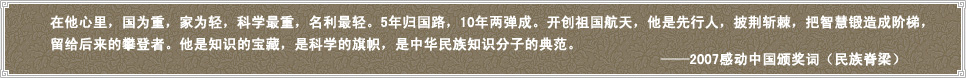 2007年“感动中国”的颁奖词描绘了钱学森先生:在他心里,国为重,家为轻,科学最重,名利最轻。5年归国路,10年两弹成,开创祖国航天,他是先人,披荆斩棘,把智慧锻造成阶梯,留给后来的攀登者。他是知识的宝藏,是科学的旗帜,是中华民族知识分子的典范。