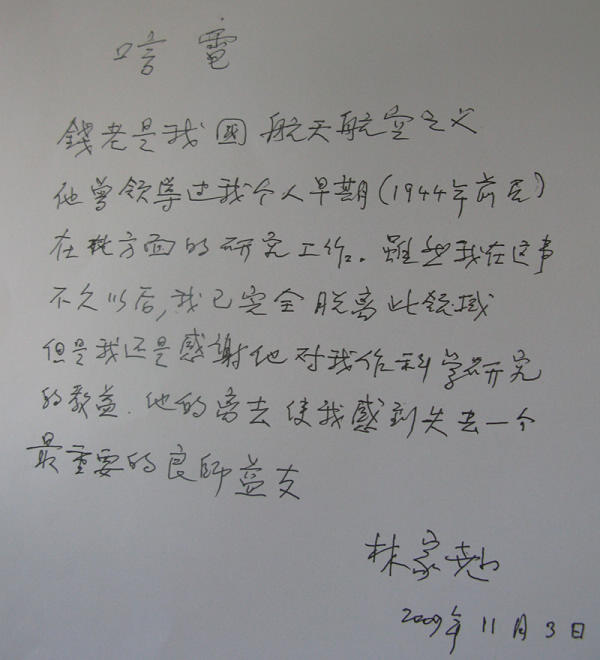 2009年11月3日下午,在凛冽的寒风中,李和娣副所长送来的小白花别在李佩先生、郑哲敏院士、前所长洪友士教授和周德进书记的胸前,此时的小花显得异常凝重,在前往吊唁力学所首任所长钱学森先生的路上,钱学森和蒋英的挚友李佩先生手拿林家翘先生的唁电:“钱老是我国航天航空之父,….他的离去使我感到失去一个最重要的良师益友”;郑哲敏院士给大家转达了大洋彼岸Frank Marble教授 (钱学森、郭永怀的好友,把钱学森手稿送回中国的功臣) 的哀思、冯元桢先生的致辞,一路不停地沉痛追忆着他与钱老相处的日子。汽车满载着Frank Marble教授、李佩先生、冯元桢先生、郑哲敏院士送来的花圈,到了钱老家里。