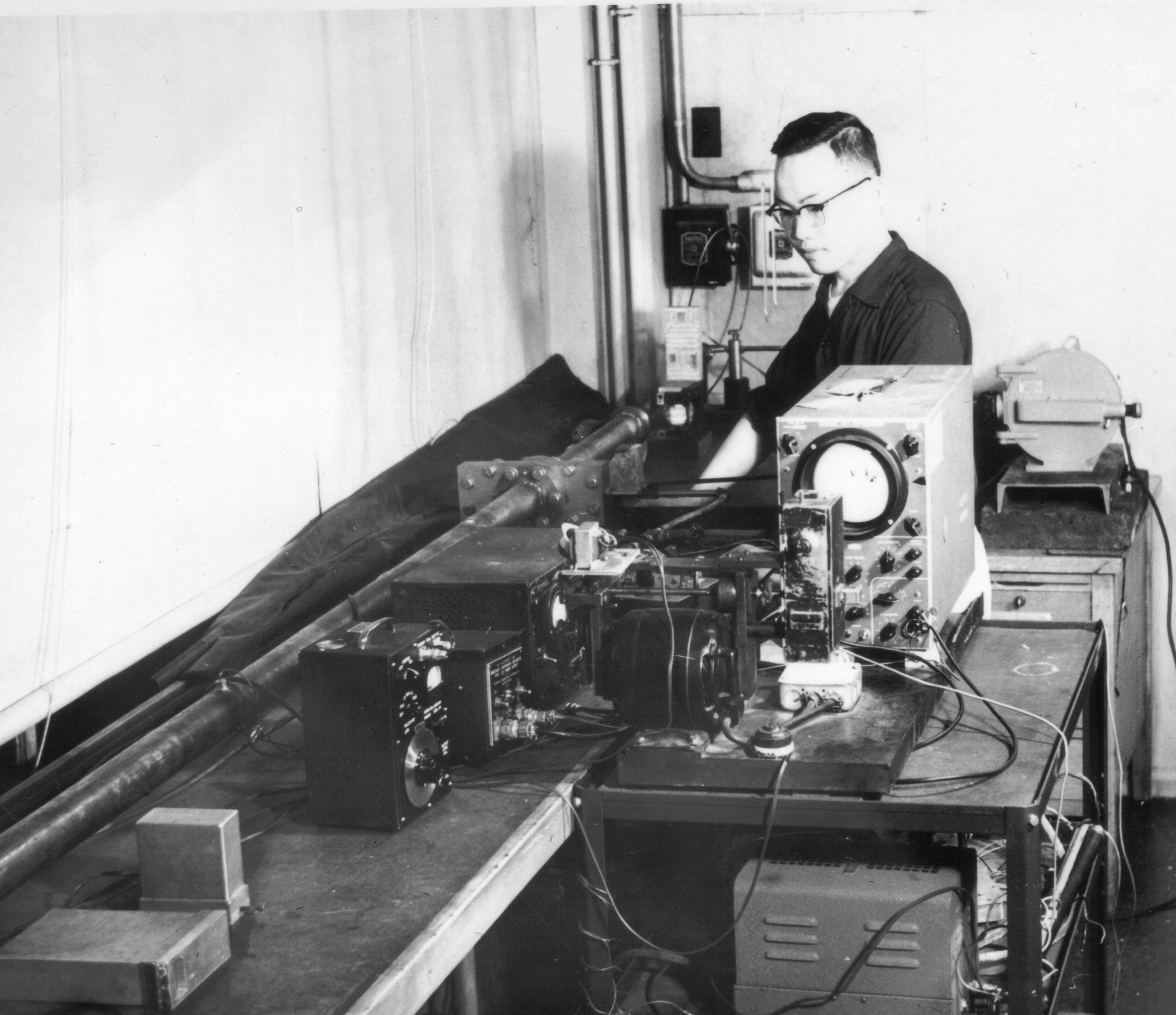 吴承康在麻省理工学院实验室中在自行研制的激波管前工作