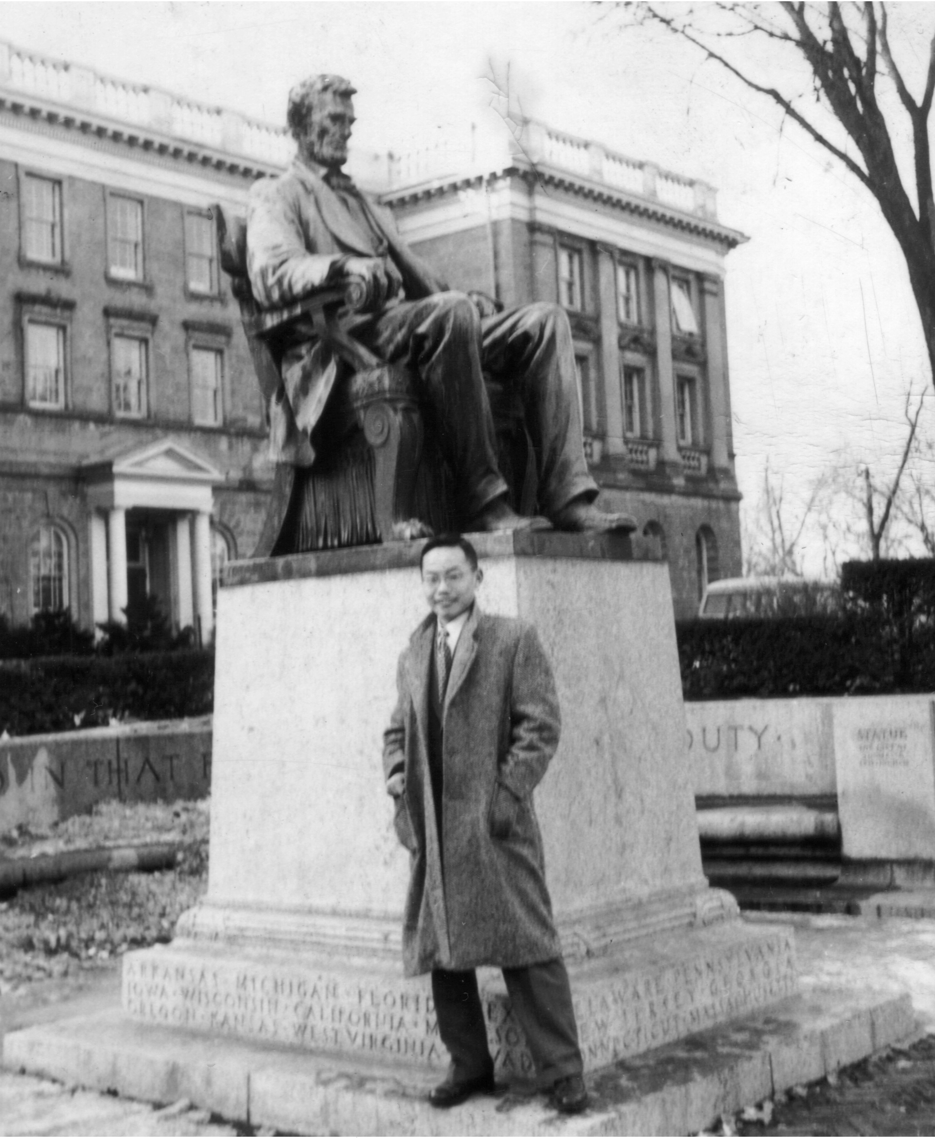 吴承康在美国威斯康辛大学校办公楼前林肯像下留影