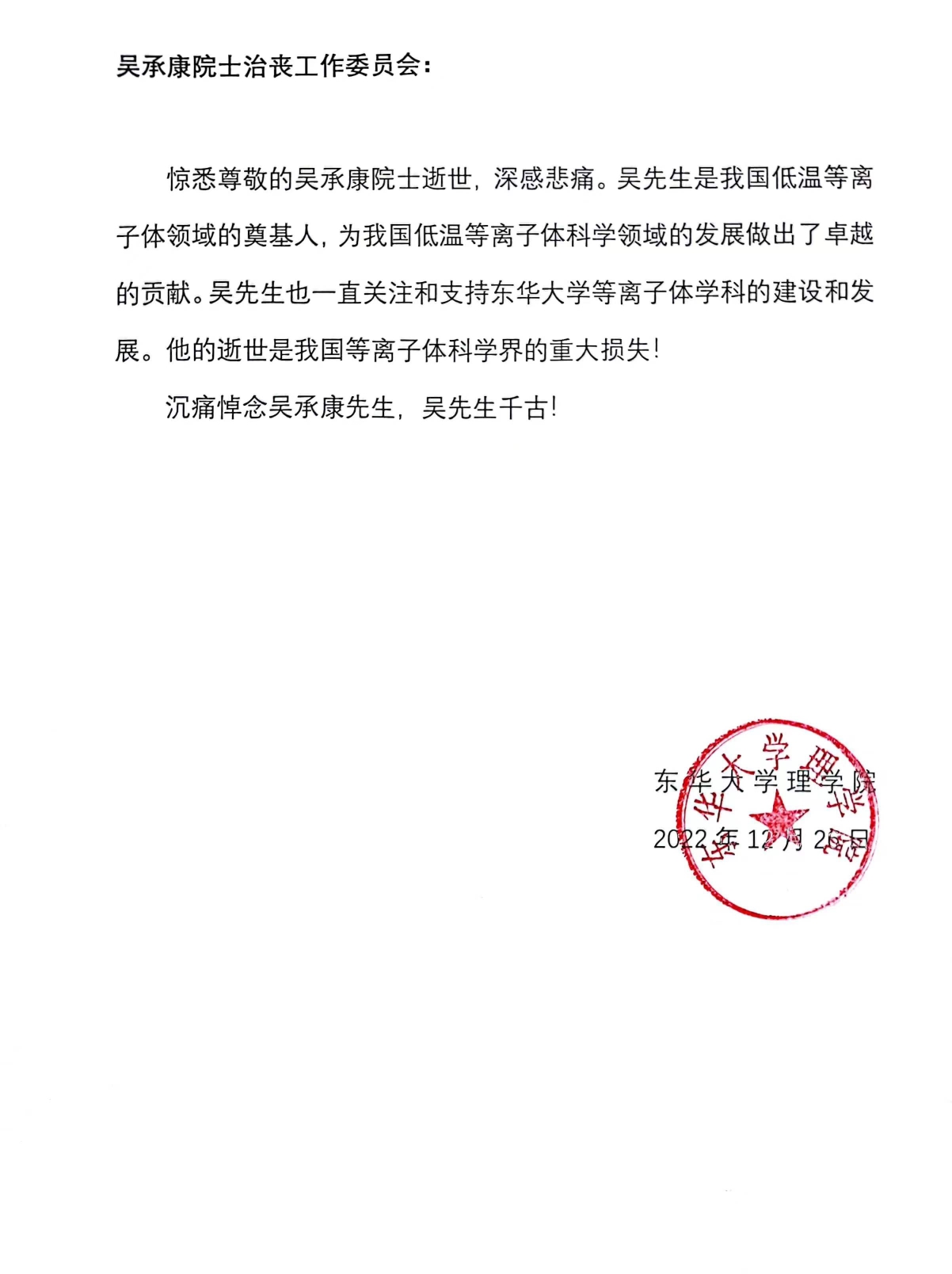 东华大学理学院致唁电