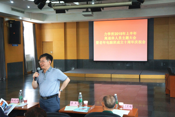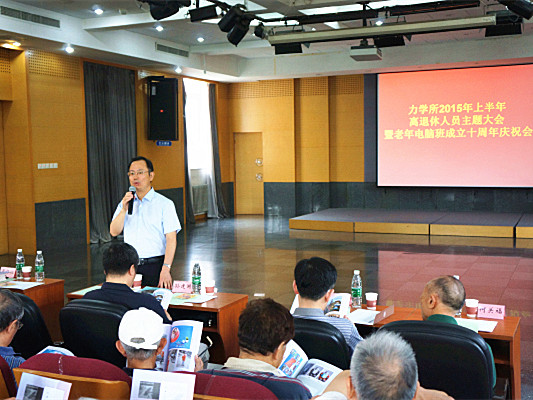 2015年6月9日,力学所离退休人员上半年主题大会暨老年电脑班成立十周年庆祝会在主楼礼堂召开。院离退局局长、老年大学校长孙建国,院离退局副局长李杰,所党委书记乔均录出席大会。院离退局原局长吴保祖、老科协力学分会理事长王柏懿、综合办副主任王宇星参会,植物所老年电脑班、北极寺干休所电脑班、力学所电脑班学员及部分离退休老同志近150人参会。大会由离退休事务主管厉文萍主持。