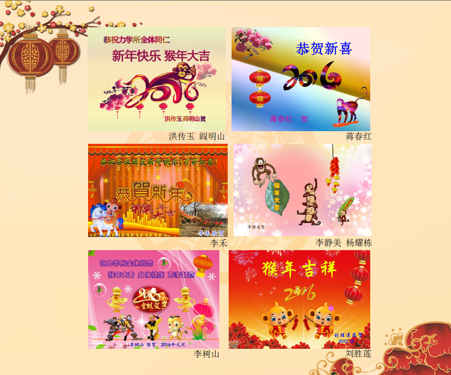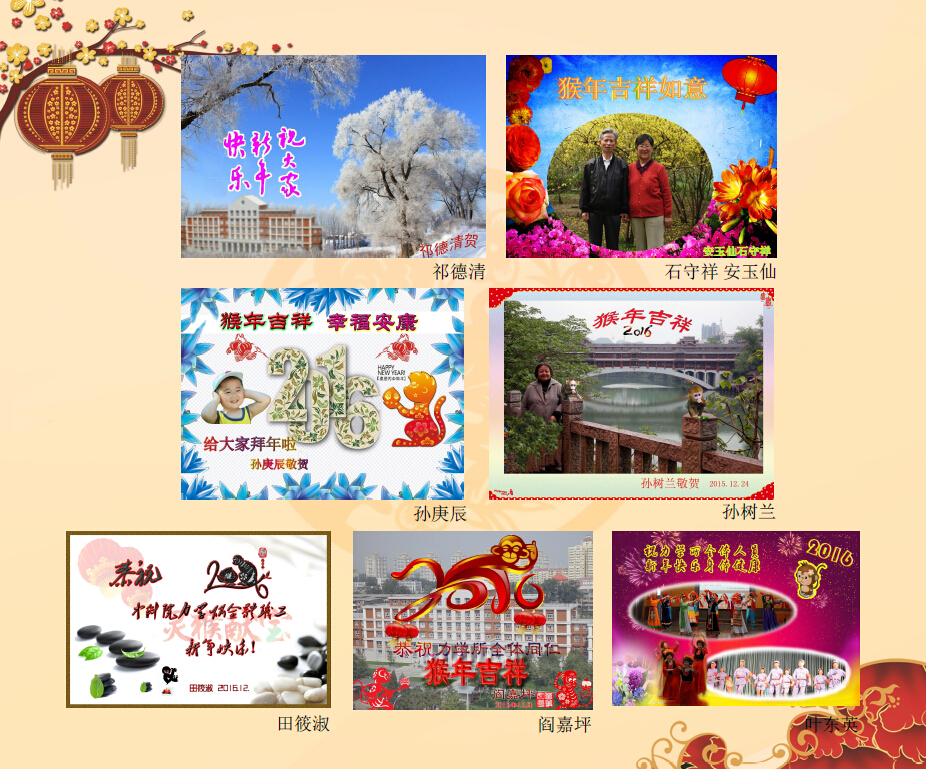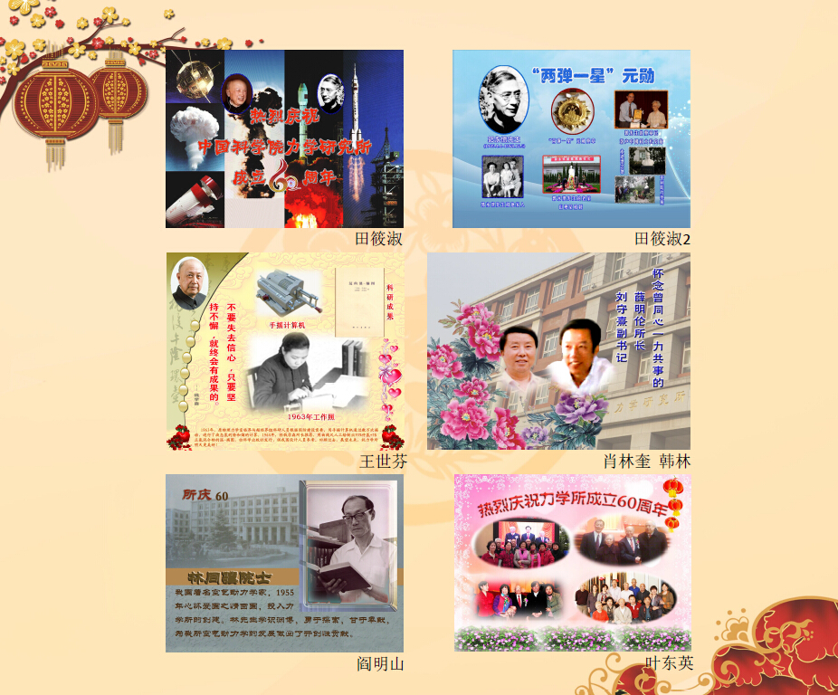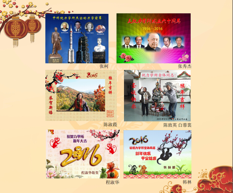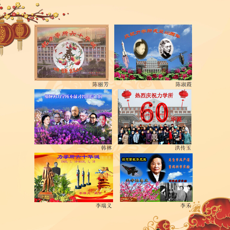 我们退休在力学所,我们仍然是力学所的一员,享受着力学所对我们的关心和照顾,老年生活丰富多彩。今天,在全所欢庆60大寿和迎接新年之际,我们用在电脑班学到的技巧,制作一些贺卡,表达我们对力学所的祝福和厚望:祝福我所成果累累、人才辈出,全所同志新年快乐、平安健康!