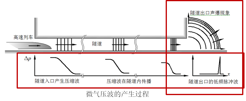 高速列车进入隧道后,隧道内的空气收到挤压,形成压力波以音速向隧道出口方向快速推进,压力波到达出口时,一部分压力波以脉冲的形式向四周发射出去,同时产生爆破声,这种波被称为隧道微气压波。微气压波主要是能量低于20Hz的次声波,可传递到400米远的地方,对生活在隧道附近的居民来说,这是一个令人讨厌的噪声环境。微气压波的大小与到达隧道口的压力波波面的压力变化的程度成正比,与到出口的距离成反比。压力变化的程度又与列车进入隧道速度的3次方成正比。一般而言,在短隧道内,微气压波与列车进入隧道速度的3次方成正比;在长大隧道内,无砟轨道结构的微气压波比有砟轨道结构的微气压波要大。为了解决微气压波问题,在车体设计上要减小车体的横截面积,使得列车横截面积与隧道横截面积的比值(阻塞比)减小,并对车头流线型进行优化设计,调整列车头部截面变化率,列车头部的截面呈线性变化,进隧道时形成的压力梯度较低,可以有效减小微气压波。