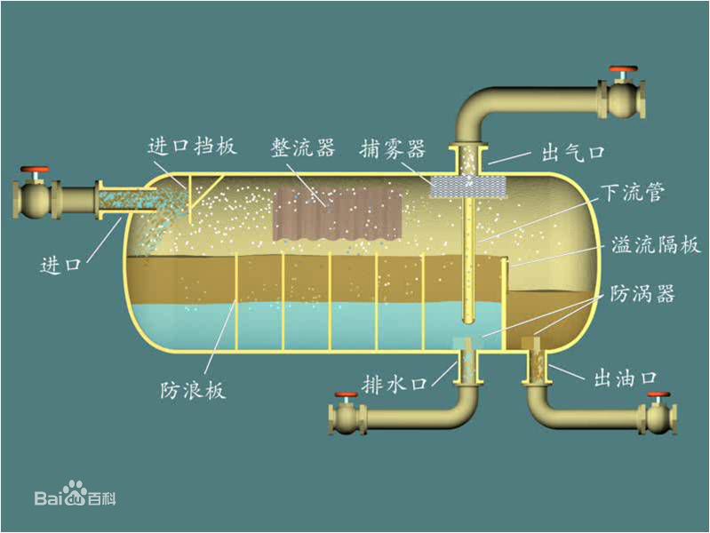 以重力沉降分离法为例,我们都知道,气体的密度 << 油的密度 < 水的密度,所以最先发生气液分离,也就是天然气先从上方出口逃逸,这也是油、气、水三家中最先“分家”的一个。剩下的油和水由于重力分层,从不同的出口流出。当然,为了让他们完全分离干净,我们还需要添加一些小的装置,例如捕雾气,溢流隔板等。