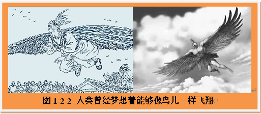 也许从学会直立行走开始,人类就已十分羡慕能够自由翱翔的鸟儿了,当然也就自然而然地把飞行的梦想寄托在自己能够拥有一对羽翼上。在古希腊的神话中,雅典人代达罗斯和他的儿子伊卡洛斯被囚禁在克里特岛上。为了逃离此岛,他们用蜜蜡和鸟的羽毛做成了翅膀,绑在自己身上,准备飞向岛外。途中伊卡洛斯忘了父亲的警告,因为飞得太高,导致蜡翼被阳光烤化而不幸坠落大海。