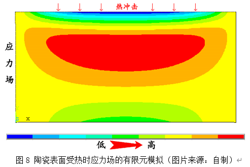 这与冷冲击时的扩展方式不同,是由于陶瓷的应力状态不同所造成的:冷冲击时表面产生拉应力,热冲击时同样根据热胀冷缩的原理内部产生拉应力。我们用有限元软件模拟了陶瓷受到热冲击的过程,计算出的应力分布(陶瓷内部应力最大)也支持这一点。图中,从蓝色到红色表示应力逐渐变大的过程(图8).