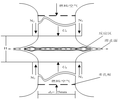 例如对冲火焰就受到许多科学家的关注并加以研究。4给出研究对冲火焰的一种实验布置[4],其中有两个喷嘴上下对称布置,它们的喷口几何尺寸相同。试验时,把预先混合好的燃料和氧化剂同时从上下两个喷嘴喷出,它们相遇后便在两个喷嘴之间形成一个稳定的轴对称流场,中间存在一个水平的滞止面。如果给两股预混气流点火,那么两个火焰就稳定在自由滞止点附近,它们和喷嘴轴向方向垂直,而且之间被燃烧产物区隔开。