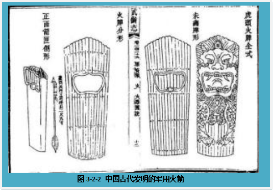 为了增进威力,当时中国人还发明了多管火箭,例如“二虎追羊”、 “神火飞鸦”、“火龙出水”、“一窝蜂”、“百虎齐奔箭”就可以一次分别发射242032100只火箭。你可以想象那该是多么壮观的情景啊!不仅如此,“火龙出水”的箭体内安装有前后2“起火”,一只用来发射“火龙”出水,另一只用来点燃箭体内的火箭射向敌方。这多么像现代的两级火箭,利用两级的接力,使得火箭可以在水面上飞行数里之远。还有一种“飞空砂筒”,简直就是现代可回收火箭的雏形,安装在前后两端的火药筒的筒口方向相反,使用时先点燃筒口向后的火药筒,火箭便向前方飞去,其中的砂子通过一个爆竹抛撒出去伤及敌人后,筒口向前的火药筒点燃,火箭便飞回原地了。